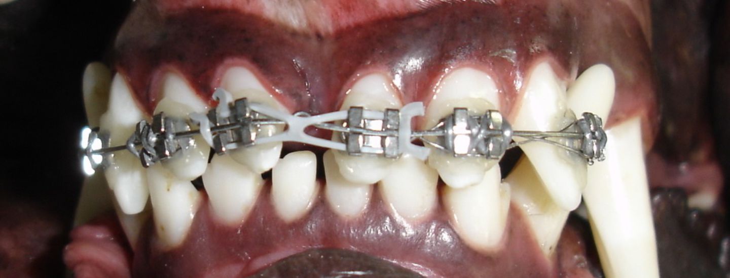 Confira abaixo um exemplo de aparelho ortodôntico em cão, utilizado para corrigir caninos inferiores lingualizados:
